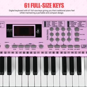 A cute pink 61-key keyboard piano for kids and beginners with built-in speakers, microphone, and a music sheet stand—perfect for early learning, practice, and fun performances at home.