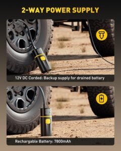 Equipped with a 7800mAh rechargeable lithium battery, the AUXITO A502 offers cordless operation for on-the-go use, while the 12V DC car power support ensures uninterrupted performance during long trips or emergencies. The built-in digital tire pressure gauge provides accurate real-time pressure readings, helping you avoid over-inflation or under-inflation for safer driving.