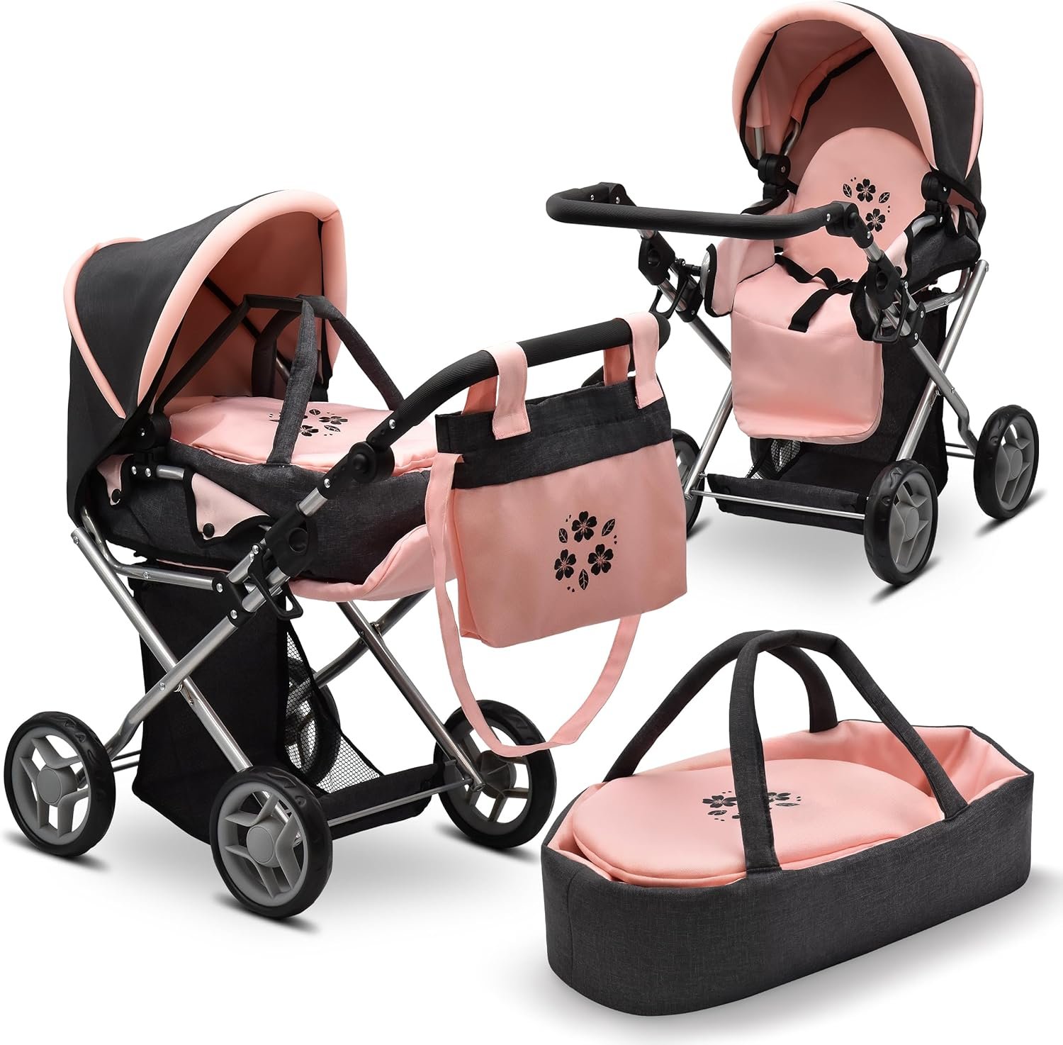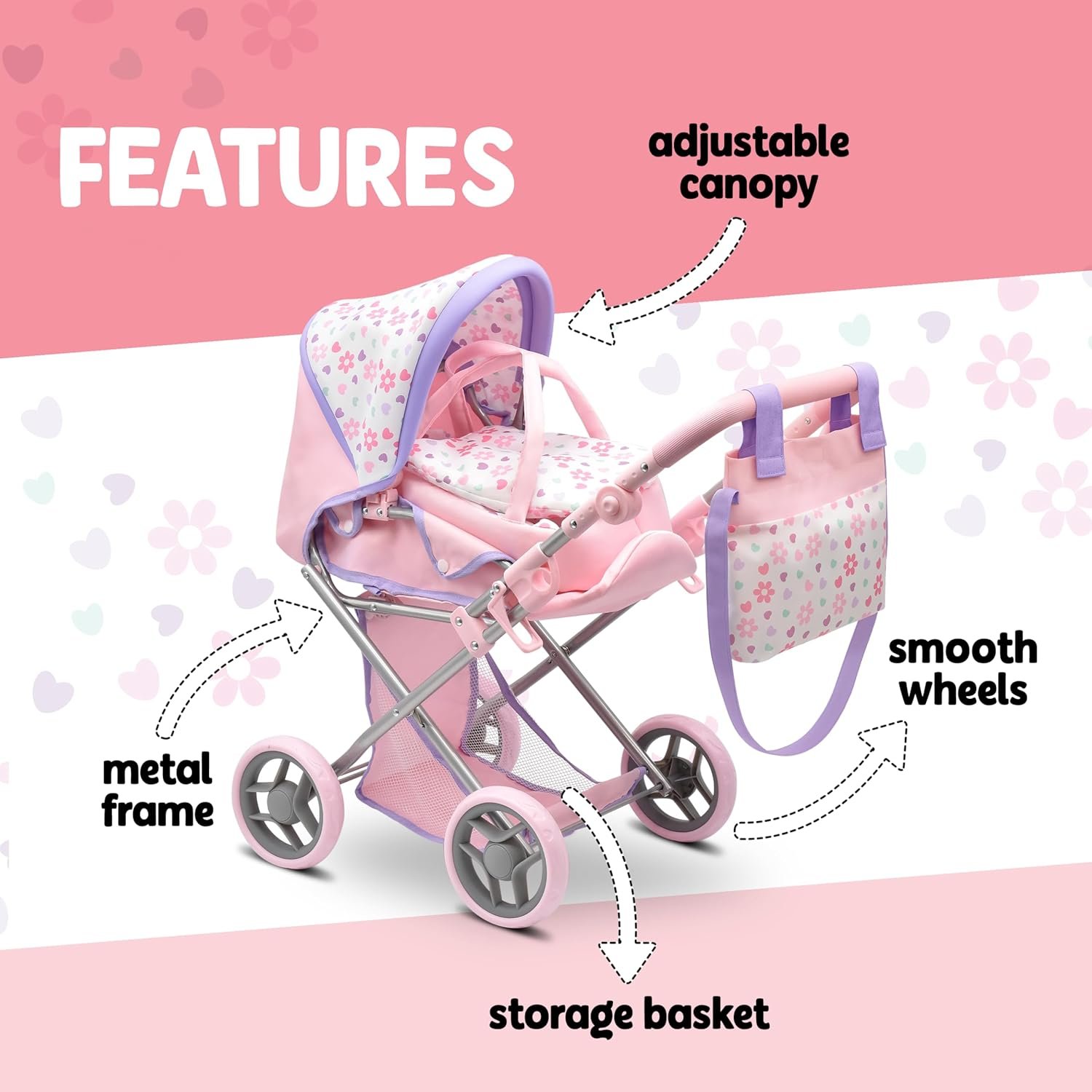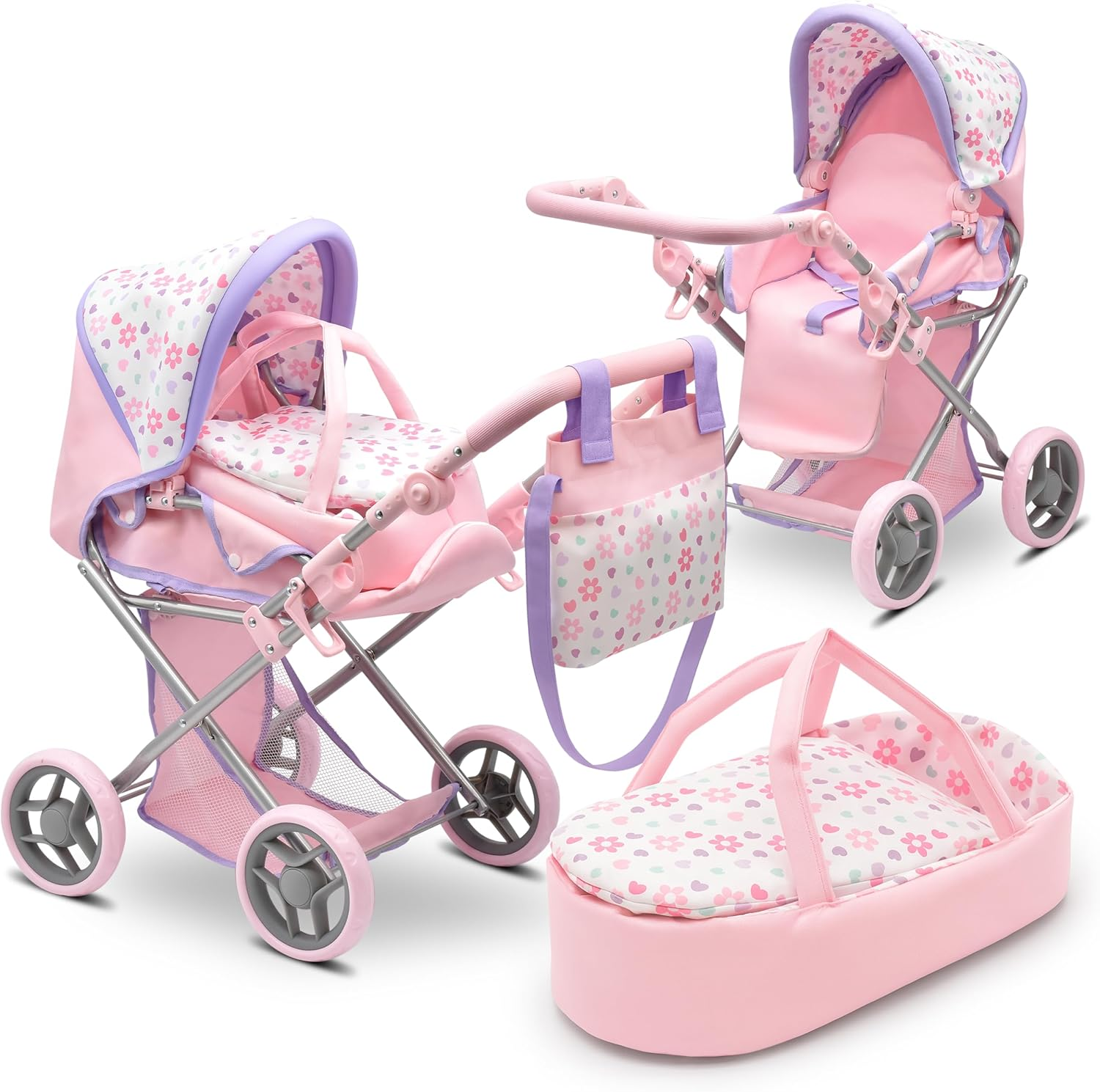 • Complete 3 in 1 Baby Doll Stroller Set: Transforms a pram to a sitting stroller or a removable bassinet carrier with storage basket and bag; features an adjustable handle to 25″; retractable canopy and safety child lock wheels; fits 12 to 18″ dolls creating endless fun