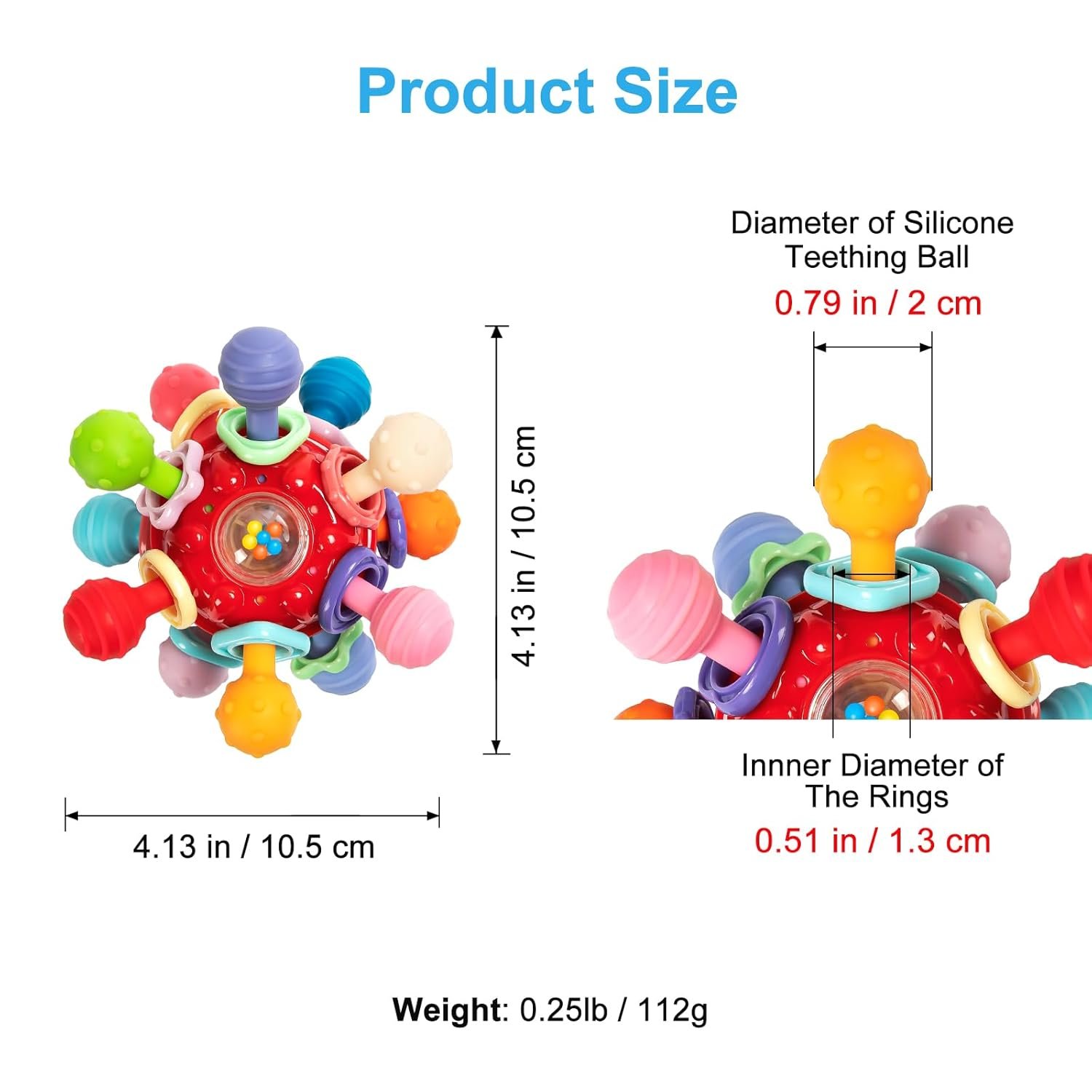 - Product size: 4.13*4.13*2.76 inch / 10.5*10.5*7 cm, Product weight: 0.25LB / 112g, Inner diameter of rings: 13mm / 0.51 inch, Diameter of silicone teething ball: 20mm / 0.79 inch. This baby toy has been tested by a CPSC approved laboratory to the ASTM F963-23 and CPSIA standard, safe to use