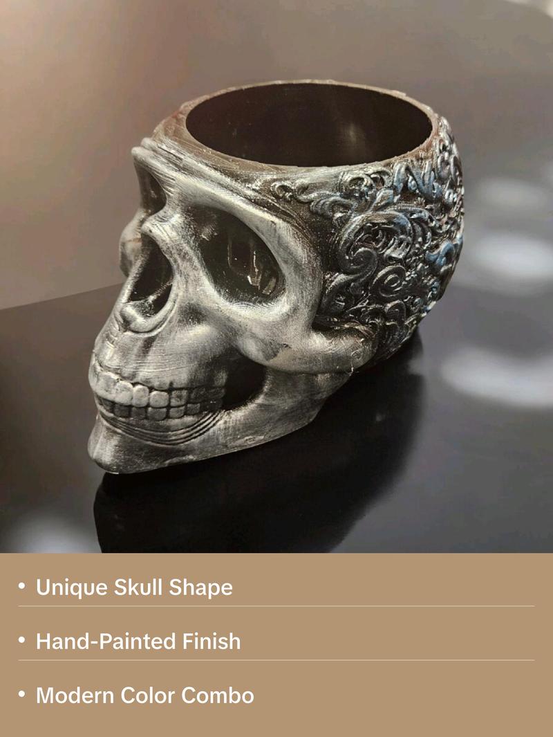 Introducing our 3D printed skull planter, a unique and visually appealing addition to your home decor. This planter is not only functional but also adds a touch of edginess to your space. The skull design is printed in 3D, ensuring that every detail is captured with precision and accuracy. The black, teal, and silver color combination gives the planter a modern and edgy look, making it a great conversation starter.