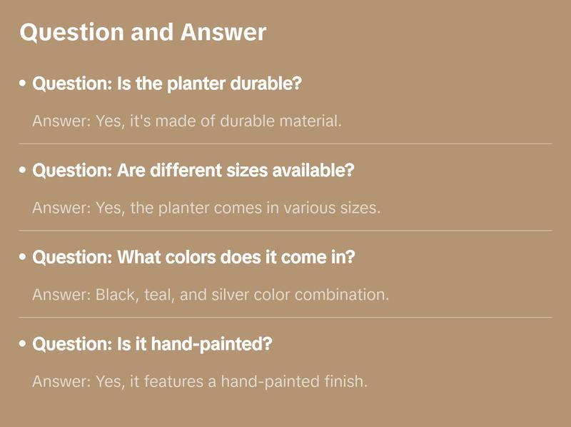 The hand-painted finish on the planter adds a personal touch, making it stand out from other planters. The black, teal, and silver color combination is perfect for those who love bold and edgy decor. The planter is made of a durable material that can withstand wear and tear, making it a great investment for your home.