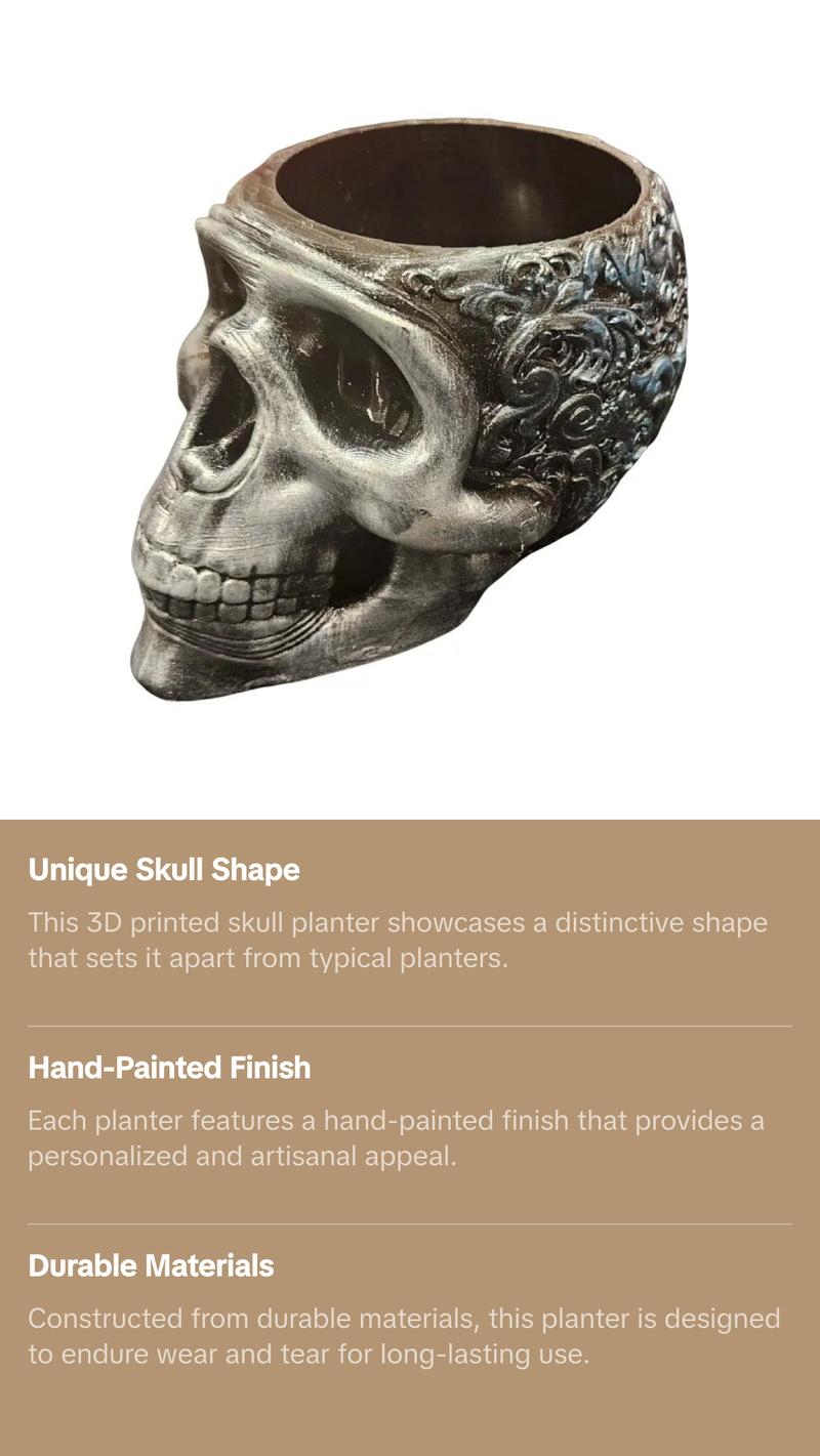 In conclusion, our 3D printed skull planter is a great addition to any home decor. The unique design, combined with the hand-painted finish, makes it a great conversation starter. The planter is made of a durable material and is available in different sizes, making it a great investment for your home.