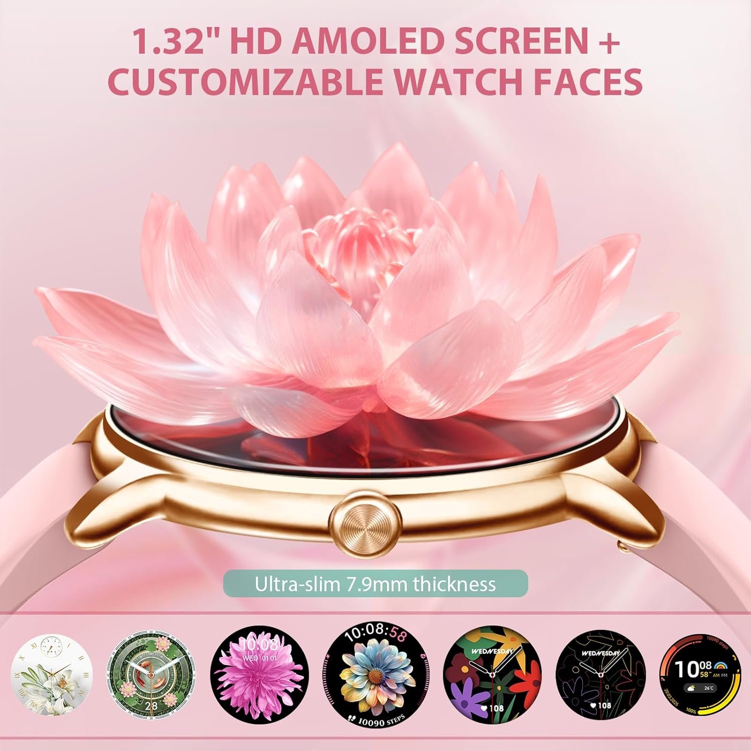- 【Ultra-Clear, Ultra-Thin & Ultra-Soft Design】 Featuring a 1.32-inch HD touch screen, this women’s smartwatch delivers crisp visuals and smooth responses. Choose from over 100 watch faces or customize your own with personal photos to make it uniquely yours. The slim profile is paired with a soft silicone strap that fits wrist sizes from 140 to 200 mm (3.94”–7.87”), making it perfect for both adults and teens—an ideal gift choice!